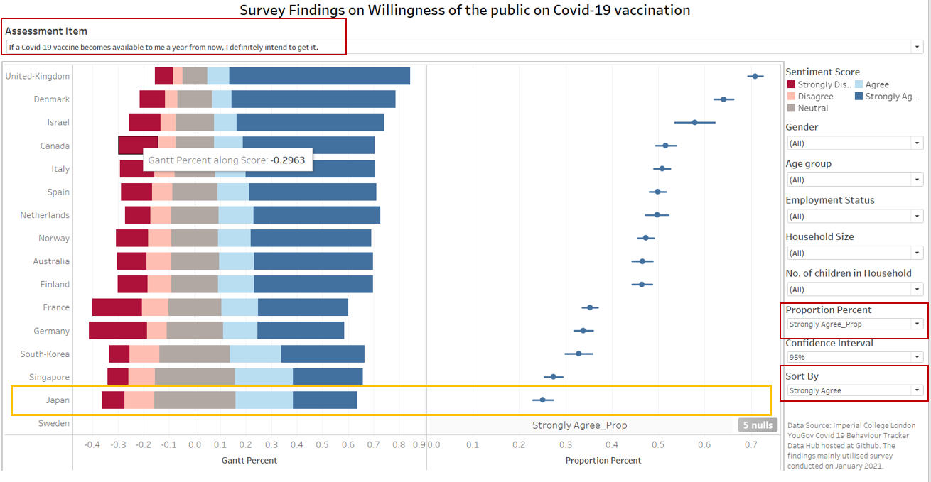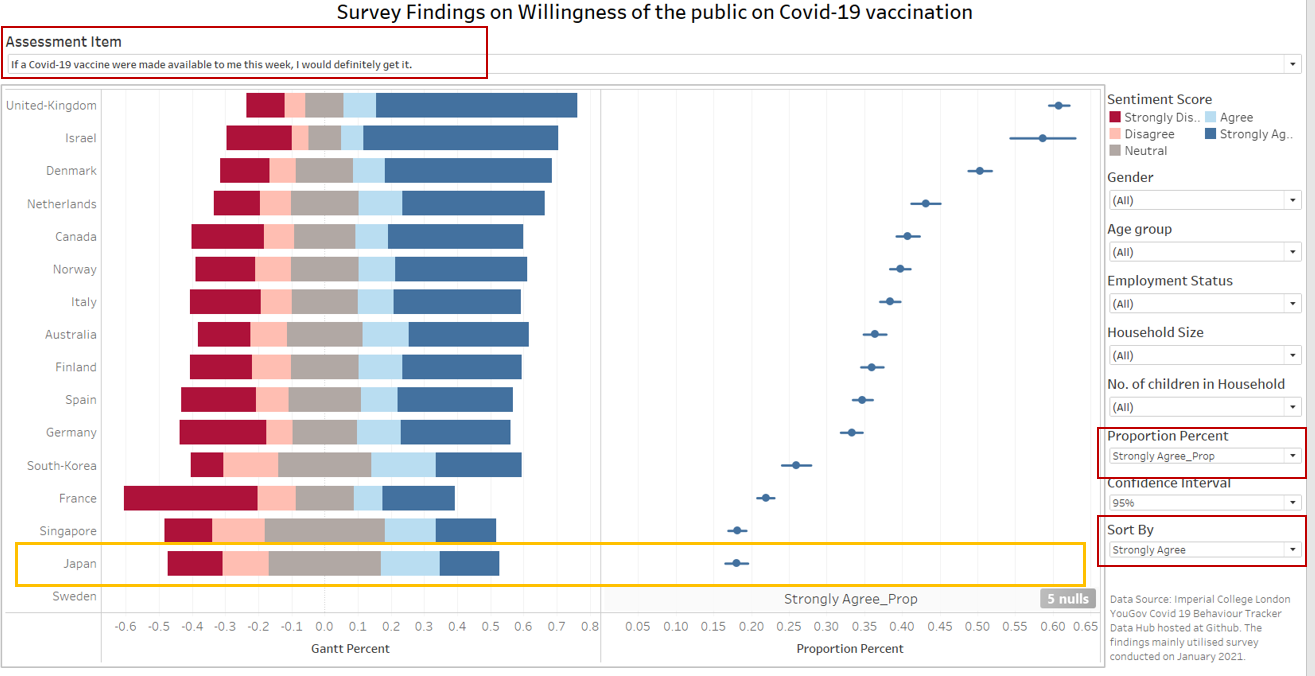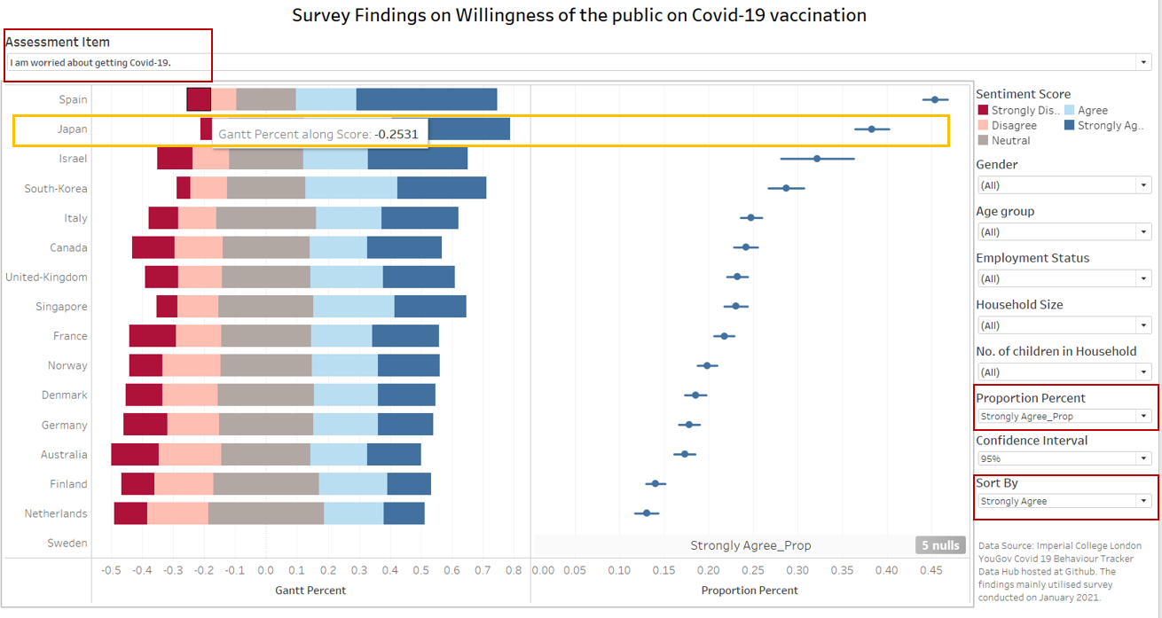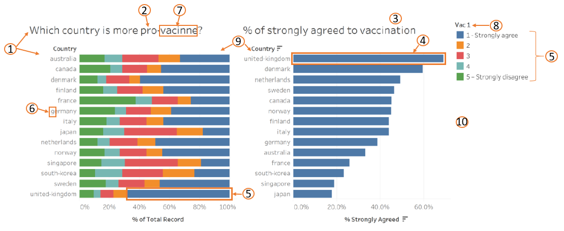 | 9 | Good use of sorting on the right chart as it clearly shows the top countries that had higher proportion of people who strongly agreed to vaccination. The left bar chart is sorted by alphabetical order which made it difficult to see the top countries that had higher proportion of “pro-vaccine”, will be better if can sort by % of “Strongly agreed” (similar to the bar chart on the right) instead. | Ensure that the charts have the same sorting order for ease of reading/referencing. |