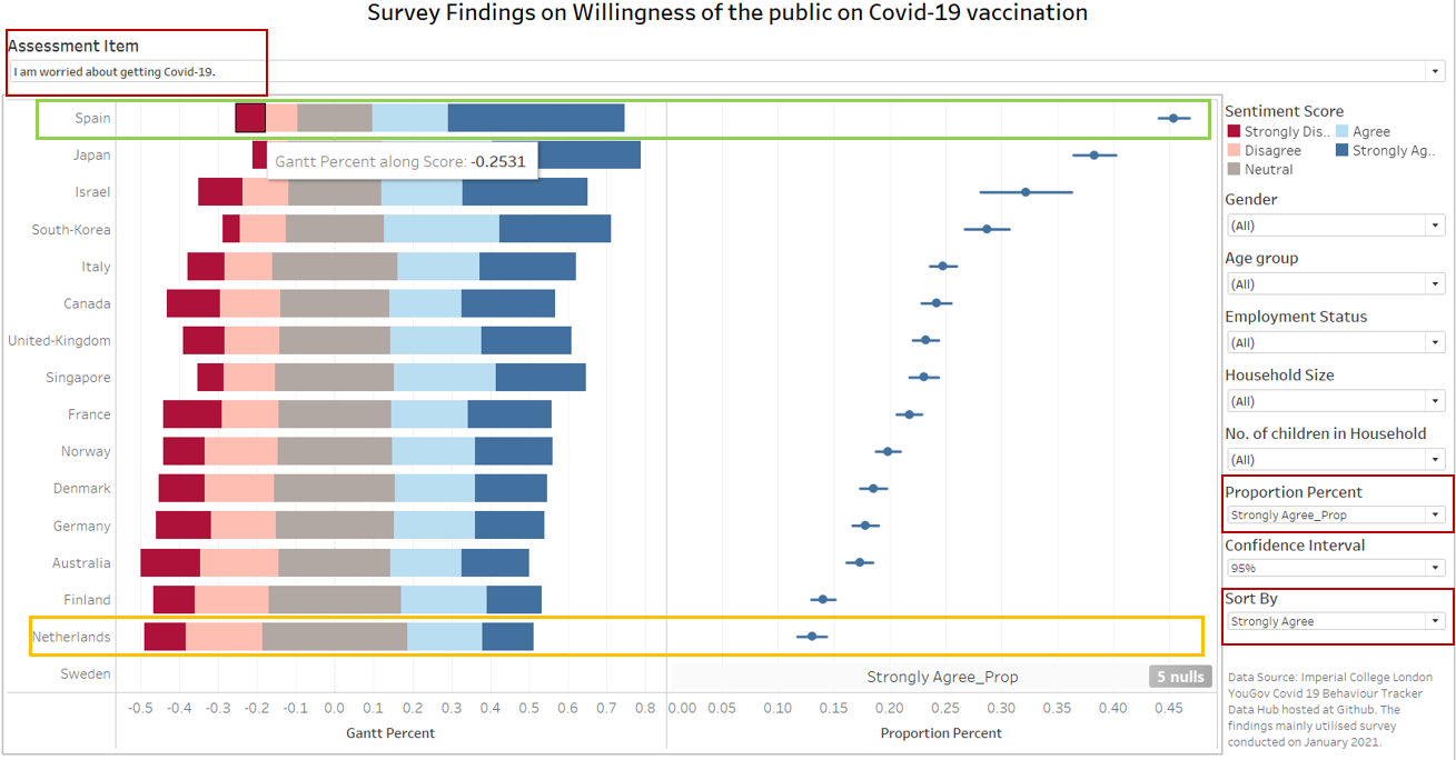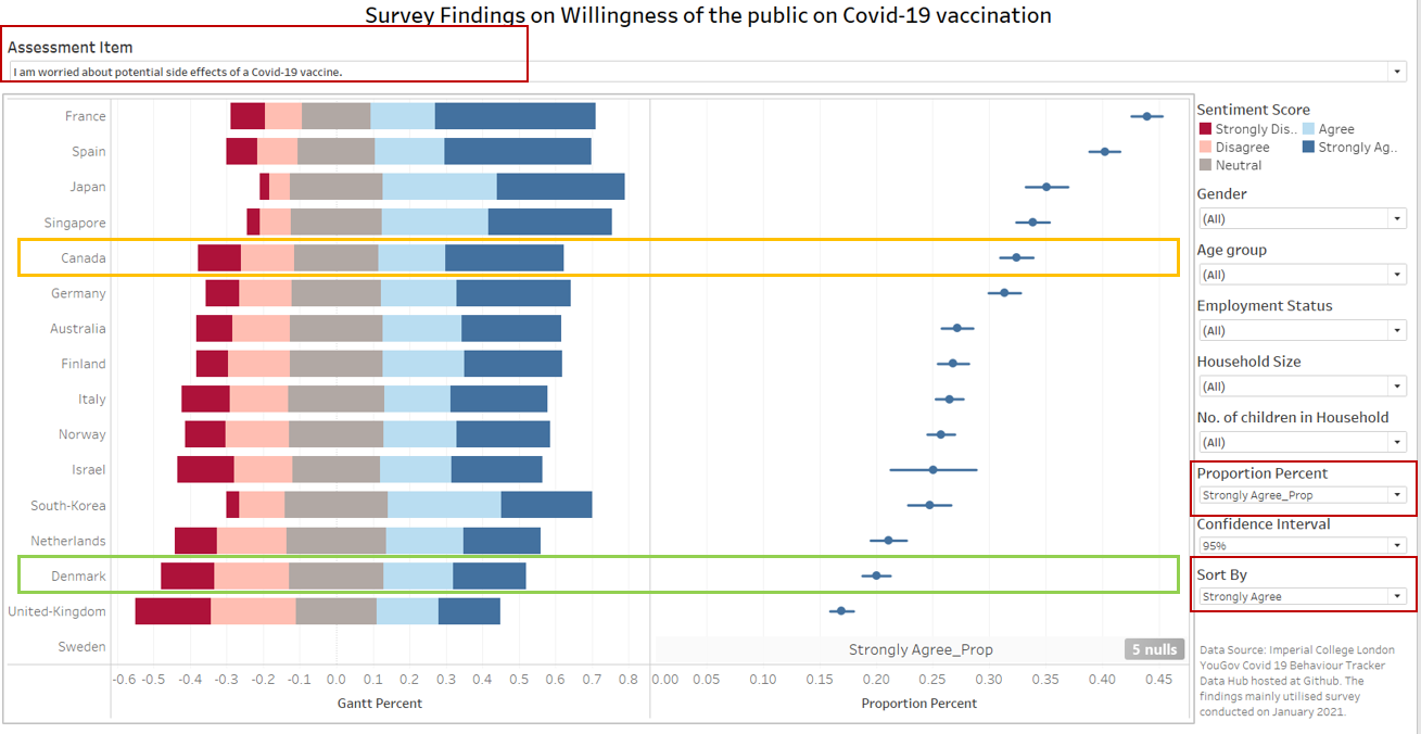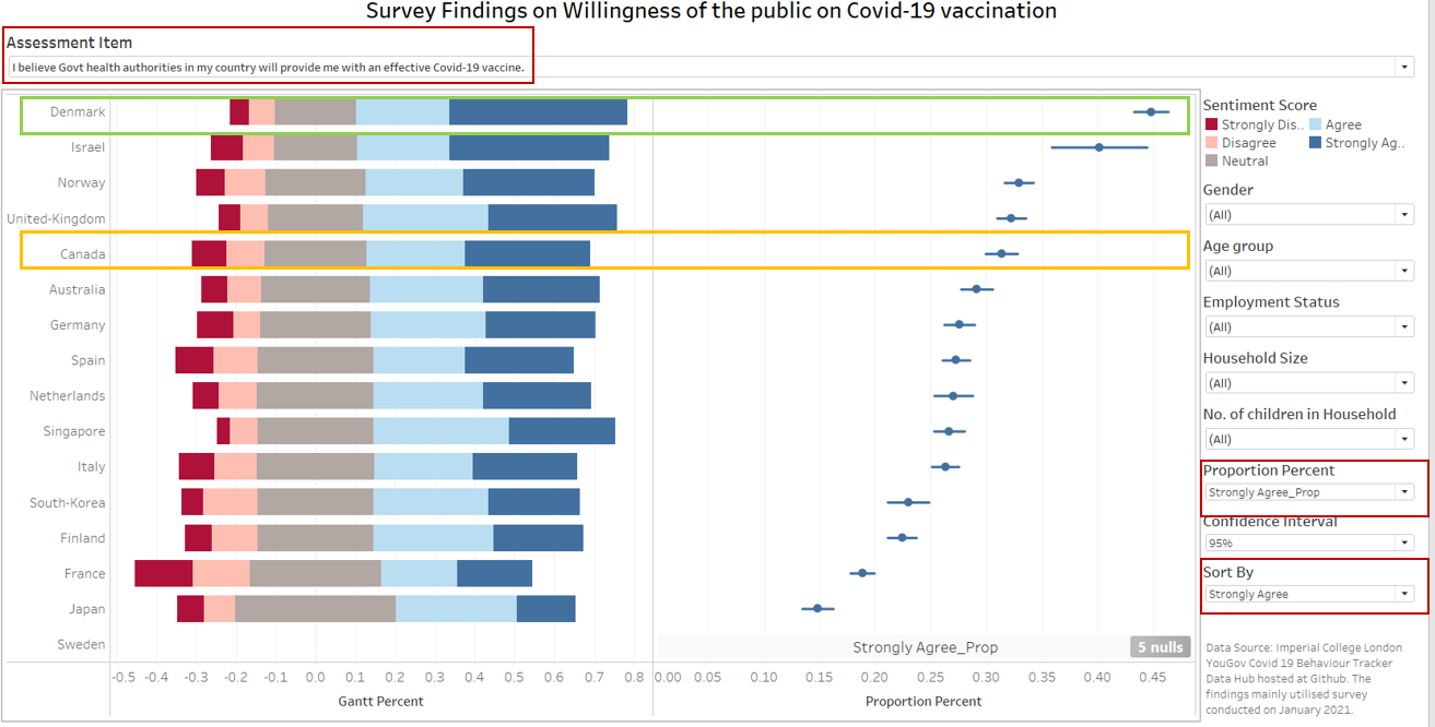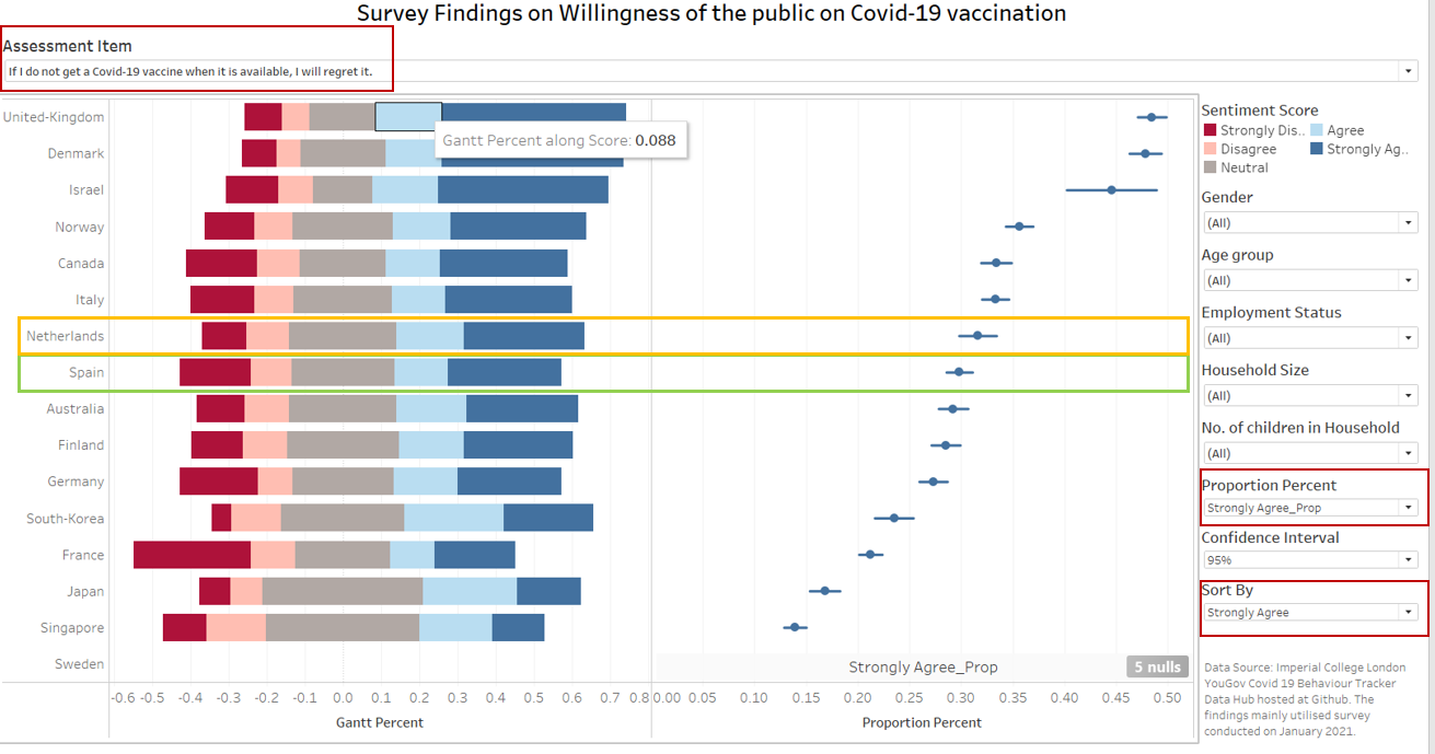 | 9 | Good use of sorting on the right chart as it clearly shows the top countries that had higher proportion of people who strongly agreed to vaccination. The left bar chart is sorted by alphabetical order which made it difficult to see the top countries that had higher proportion of “pro-vaccine”, will be better if can sort by % of “Strongly agreed” (similar to the bar chart on the right) instead. | Ensure that the charts have the same sorting order for ease of reading/referencing. |