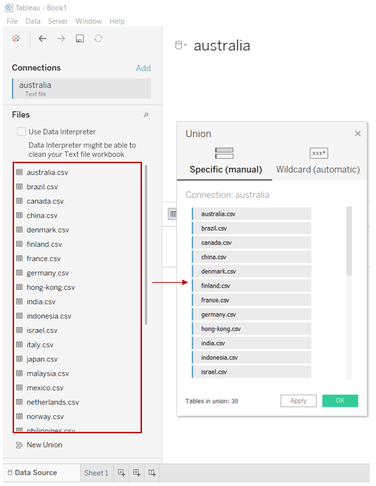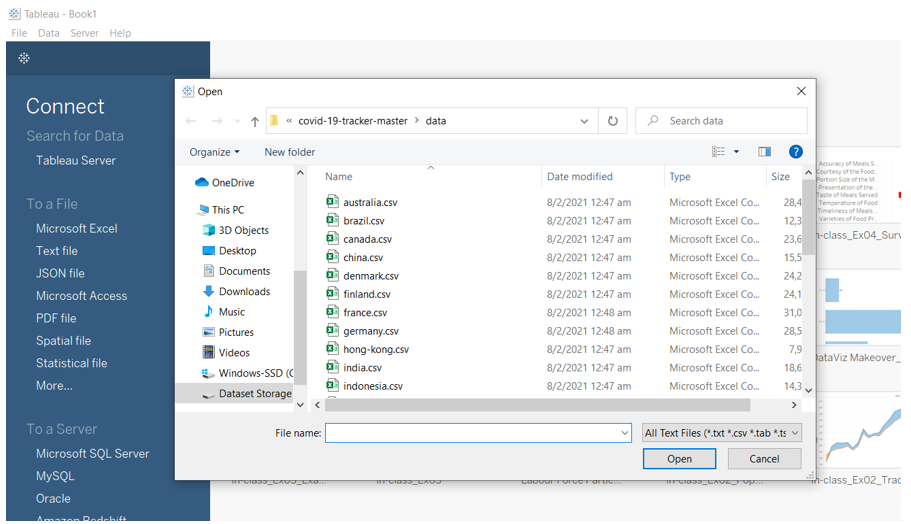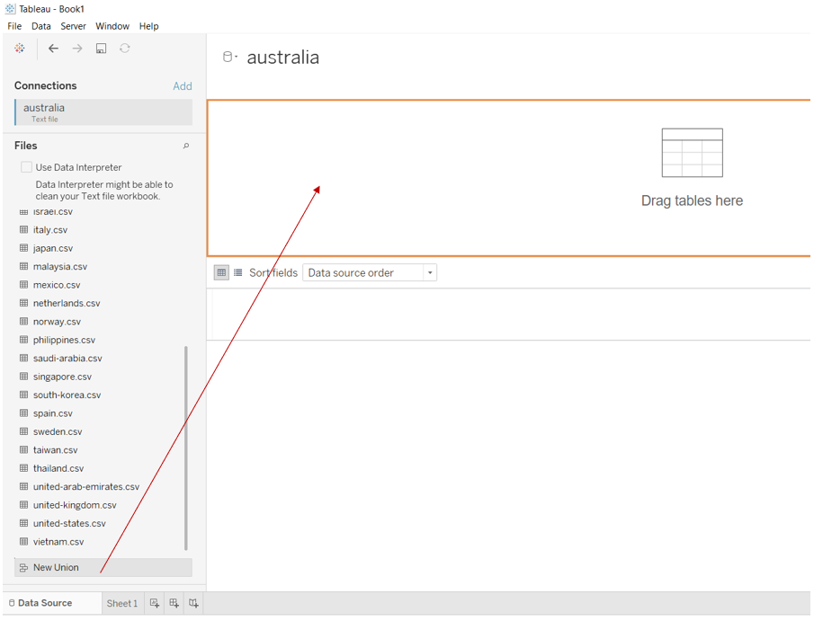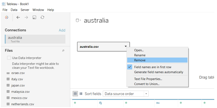 Step 1: Open a new Tableau window, click on ‘Text file’ and navigate to the data file. Select the first country file e.g. “australia.csv”.