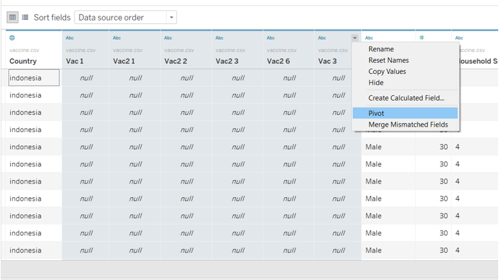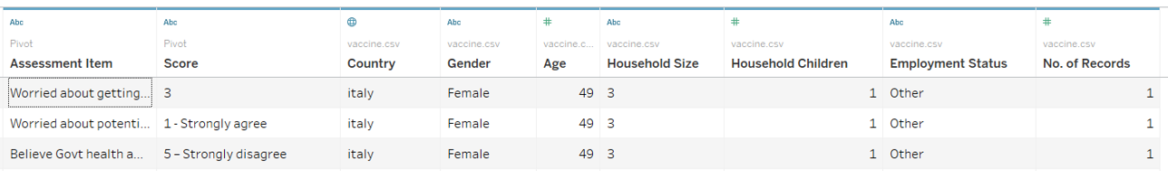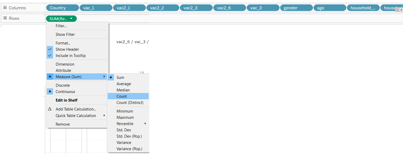 Step 5: Open a new Tableau worksheet and drag “Country”, “vac_1”, “vac2_1”, “vac2_2”, vac2_3”, “vac2_6”, “vac_3”, “gender”, “age”, “household_size”, “household_children”, “employment_status” to “Columns” and “RecordNo” to Rows. Right click “RecordNo” and change to “Count”.
