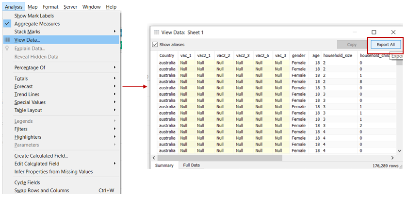 Step 6: Save out the dataset by clicking on “Analysis” tab, select “View Data” and thereafter select “Export All”. Save the dataset as “vaccine” to a folder.