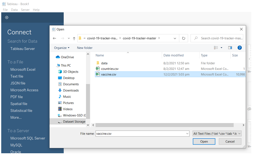 Step 1: Open a new Tableau window, click on “Text file” and open the “vaccine.csv” file save out earlier (Step 6 of 3.1).