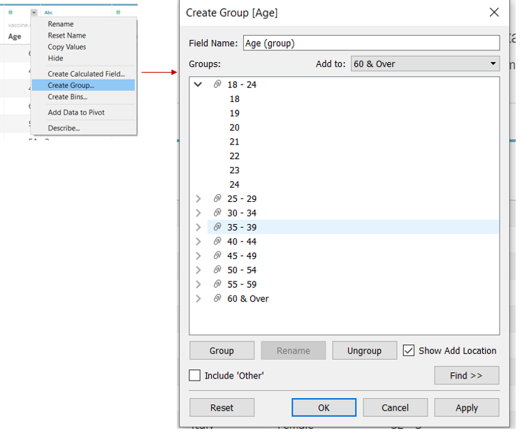 Step 10: Click on the drop down list for “ Age” and select “Create Group”. Create the groups as shown below.