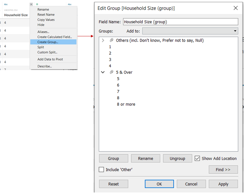 Step 11: Click on the drop down list for “ Household Size” and select “Create Group”. Create the groups as shown below.