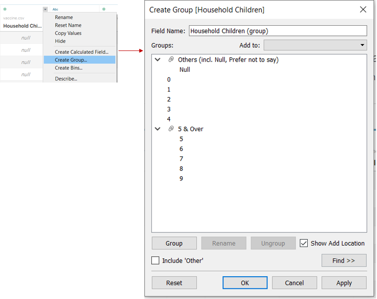 Step 12: Click on the drop down list for “ Household Children” and select “Create Group”. Create the groups as shown below.