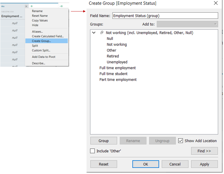 Step 13: Click on the drop down list for “ Employment Status” and select “Create Group”. Create the groups as shown below.