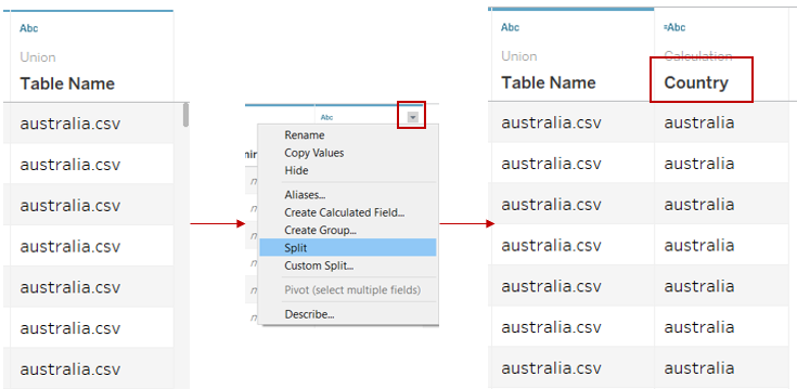 Step 5: Split the column “Table Name” by clicking on the drop down list and select “Split”. Rename the new column as “Country”.