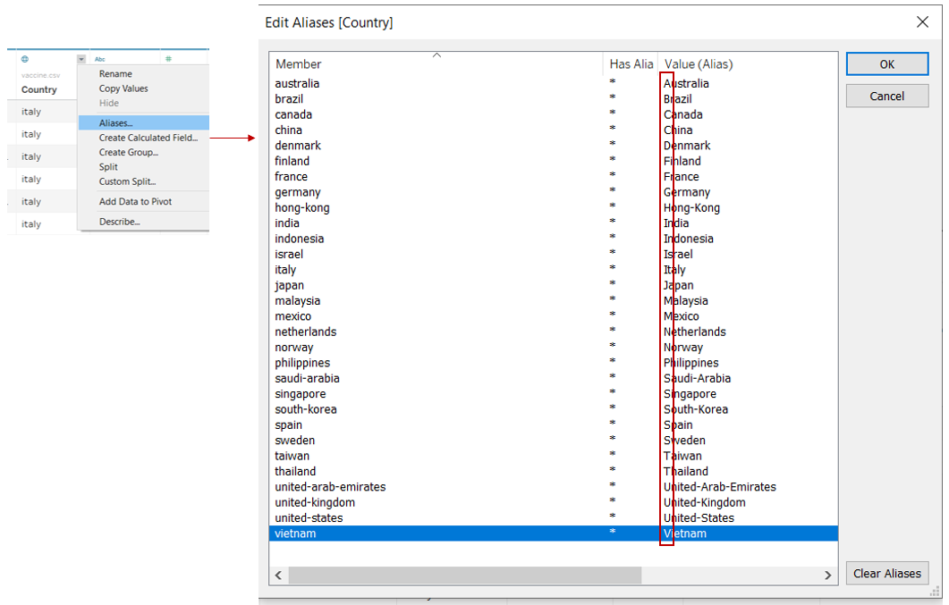 Step 6: Click on the drop down list for “Country” and select “Aliases” and rename the countries to reflect Upper case for the first alphabet of the country name.
