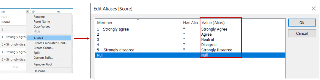 Step 7: Click on the drop down list for “Score” and select “Aliases” and rename the values as shown below.
