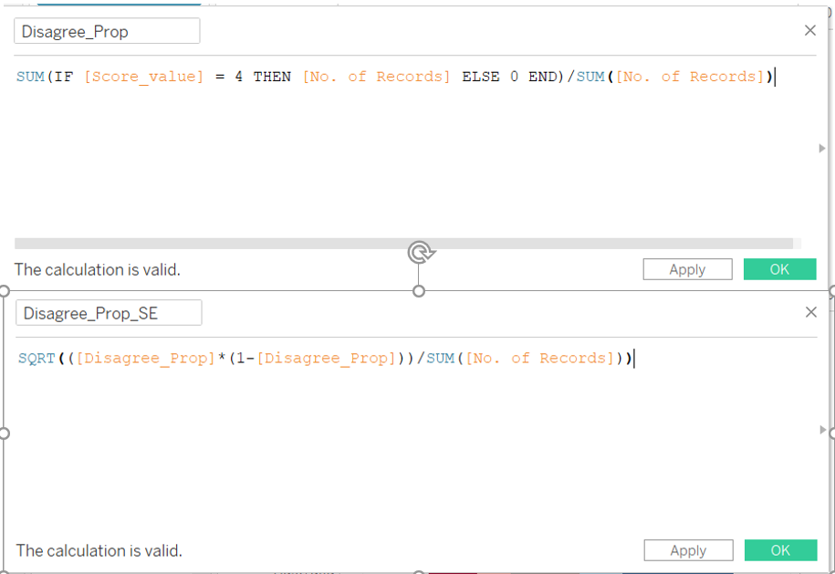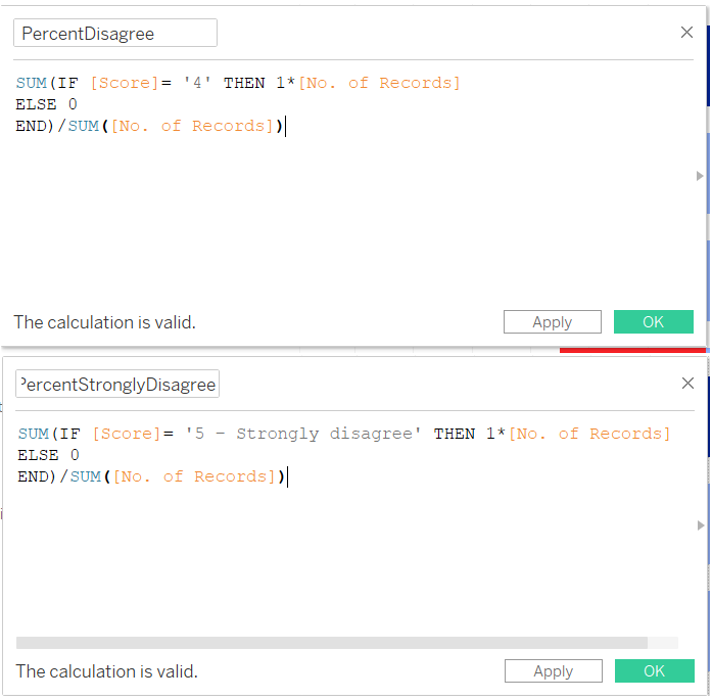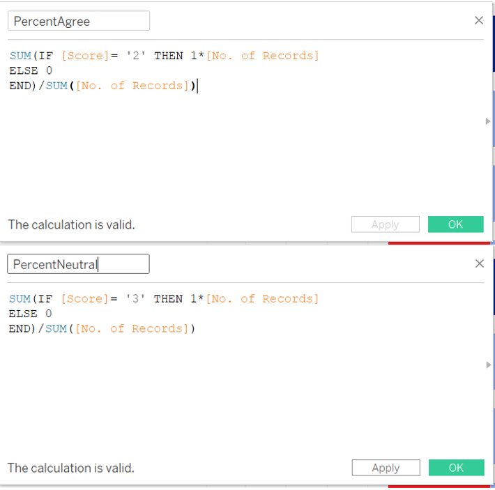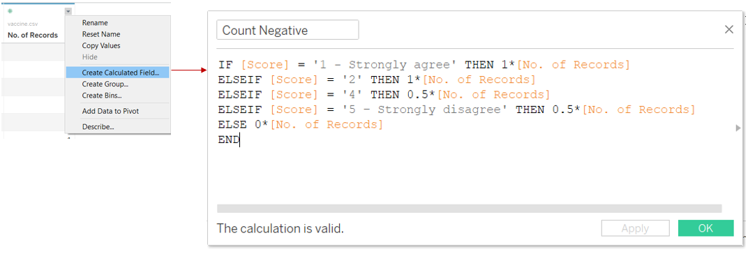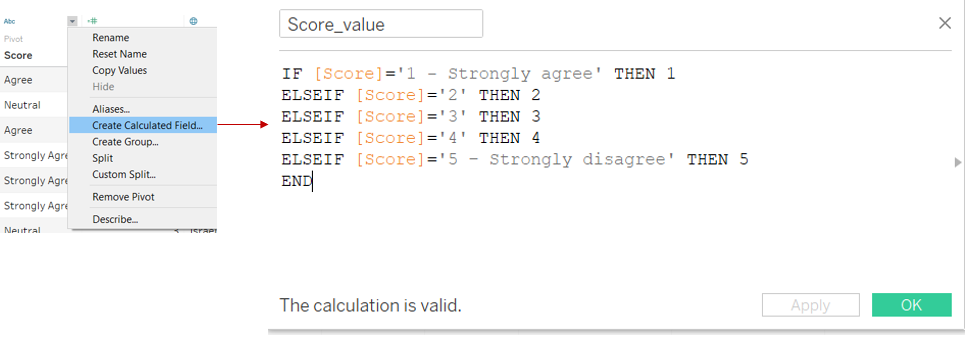 Step 8: Click on the drop down list for “Score” and select “Create Calculated Field”. Input the following formula into the pop-up window.