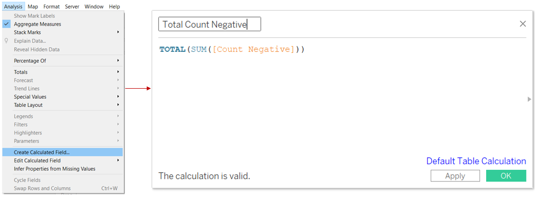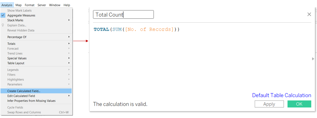 Step 1: Open a new Tableau workbook. Create calculated field “Total Count” by clicking on “Analysis” on the ribbon tab and select “Create Calculated Field”. Input the formula shown below.