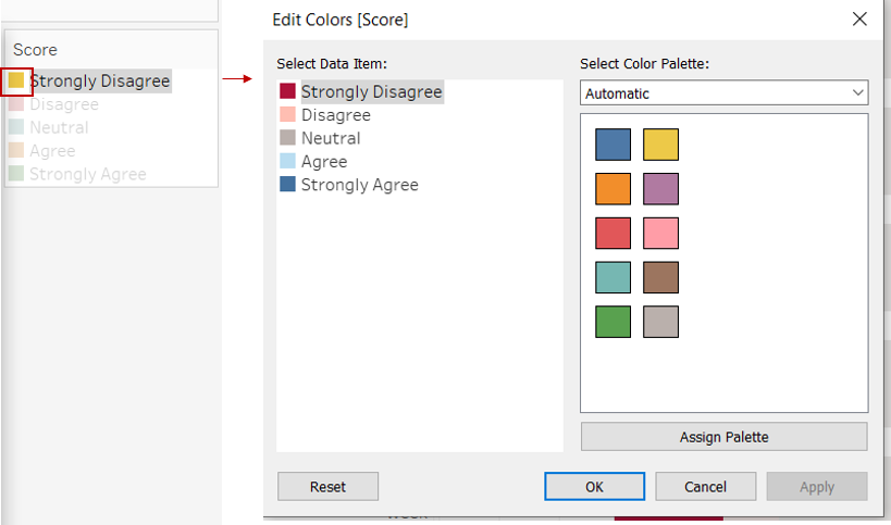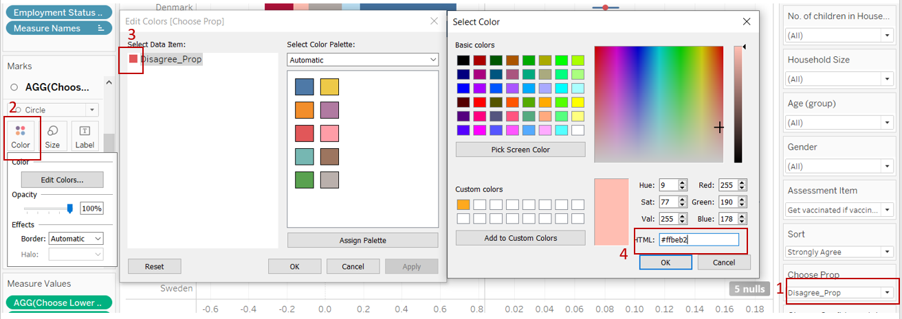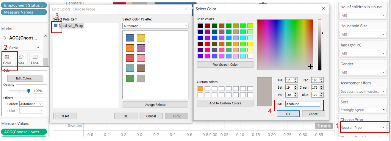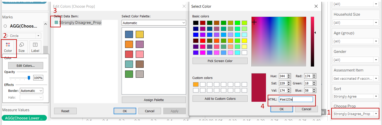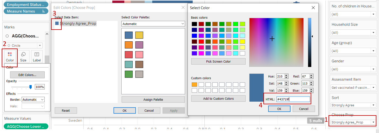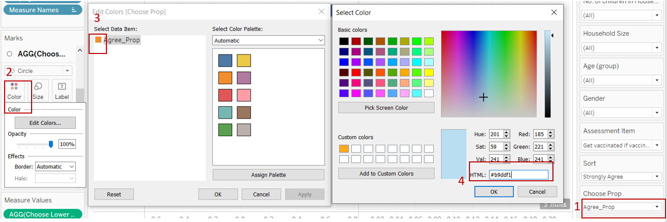 Step 13: In the “Choose Prop” paramter, select “Strongly Agree_Prop”. Click on “Colour”, Click on the colour box and input the colour code as shown. Repeat the same steps to sync the colours for “Agree_Prop”, “Neutral_Prop”, “Disagree_Prop” and “Strongly Disagree_Prop” as shown below.
