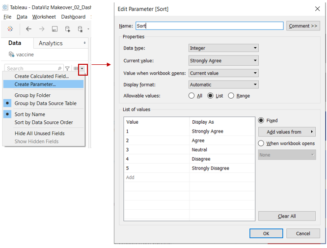 Step 11: To create a sorting option in the visualisation, click on the drop down list, and select “Create Parameter”. Input the values as shown below.