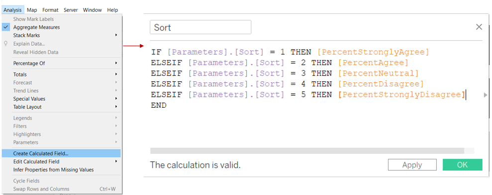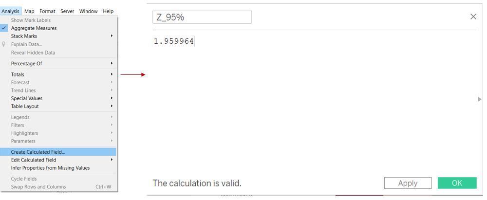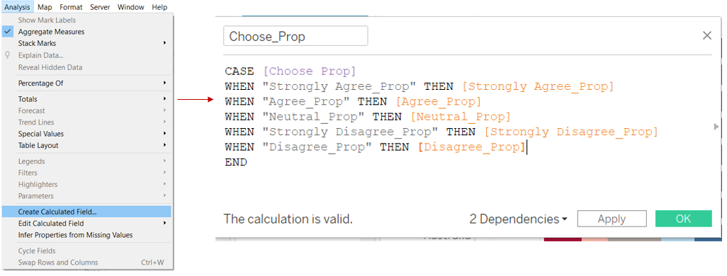 Step 1: Create more calculated fields. Click on “Analysis” on the ribbon tab and select “Create Calculated Field”, input the formula shown below. Repeat the steps to create the other calculated fields shown below.