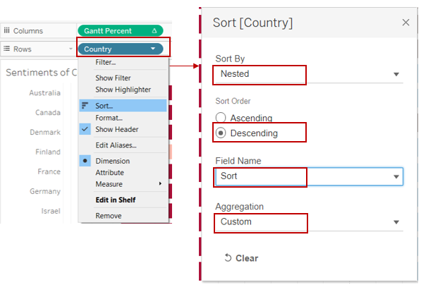 Step 13: Click “Country”, select “Sort”. Select the options as shown below.