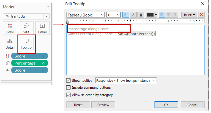 Step 14: In the Marks card, click on “Tooltip”. Remove the first line from the tooltip (in red box).