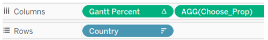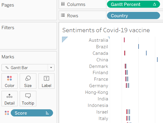 Step 3: Drag “Gantt Percent” into “Columns”, “Country” into “Rows” and “Score” into the colours Marks card as shown below.