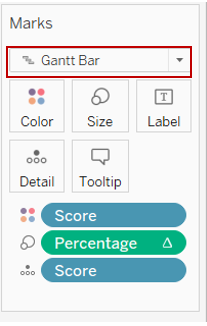 Step 5: Under the Marks card, drag “Percentage” into the “Size” and “Score” into “Detail”. Select “Gantt Bar” from the drop down list.