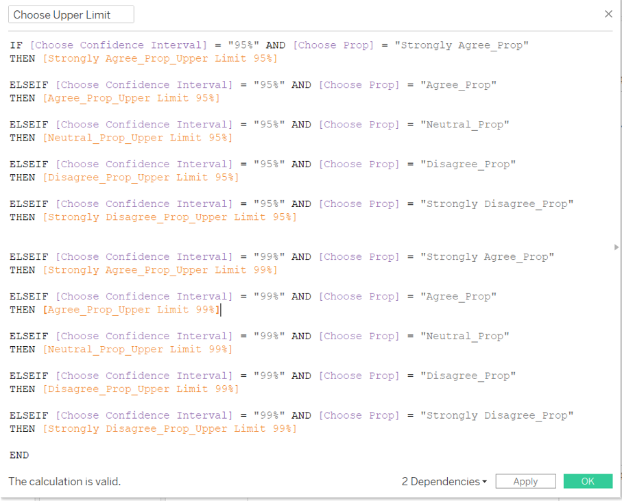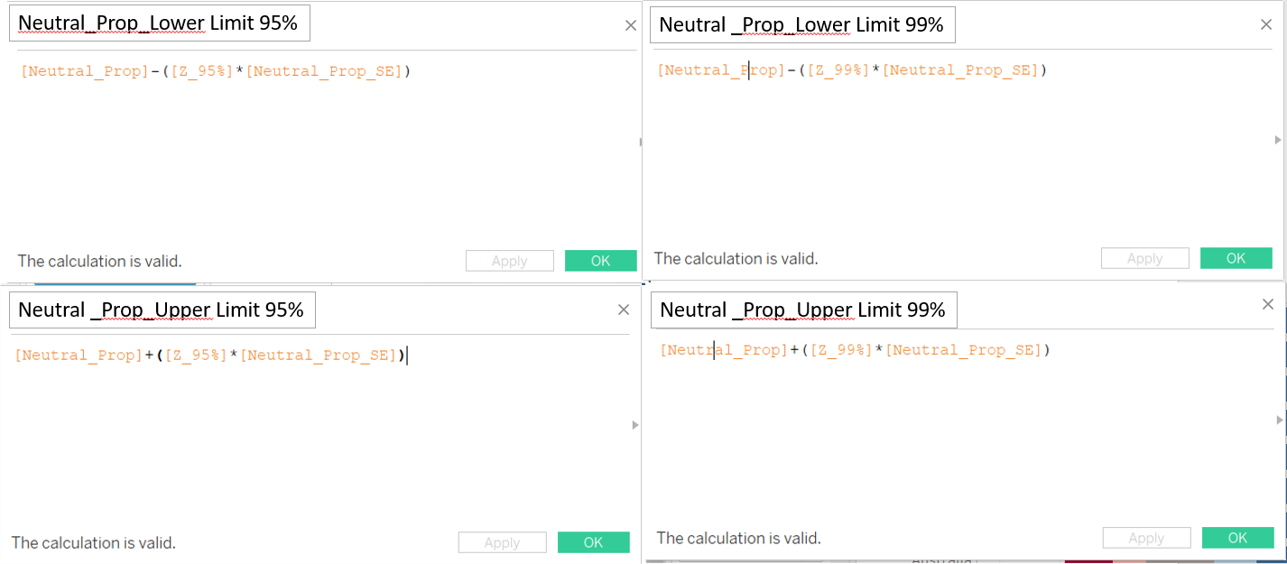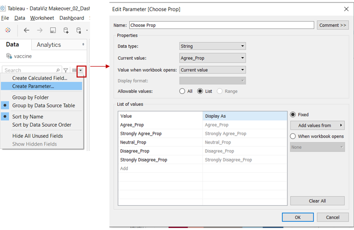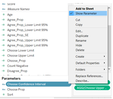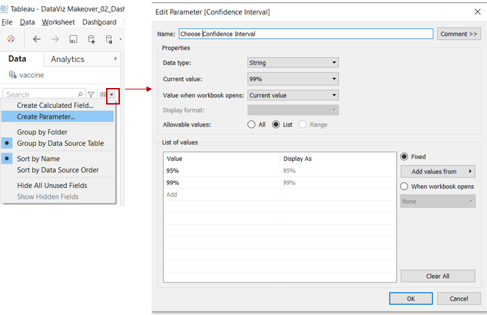 Step 2: To create a dynamic visualisation of the proportion chart (choose which sentiment to filter and at which Confidence interval), click on the drop down list, and select “Create Parameter”. Input the values as shown below.
