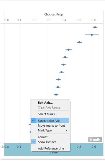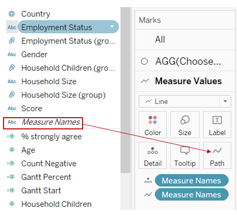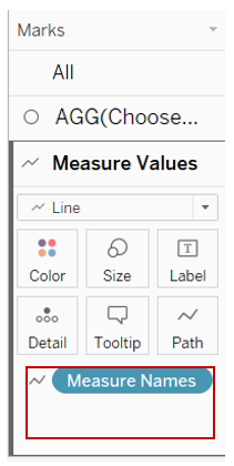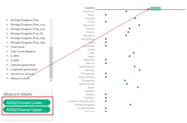 Step 5: Pull “measure value” to the top of the chart (along the top of x-axis). In the Measure Values card, keep only “AGG(Choose Lower Limit)” and “AGG(Choose Upper Limit)”.