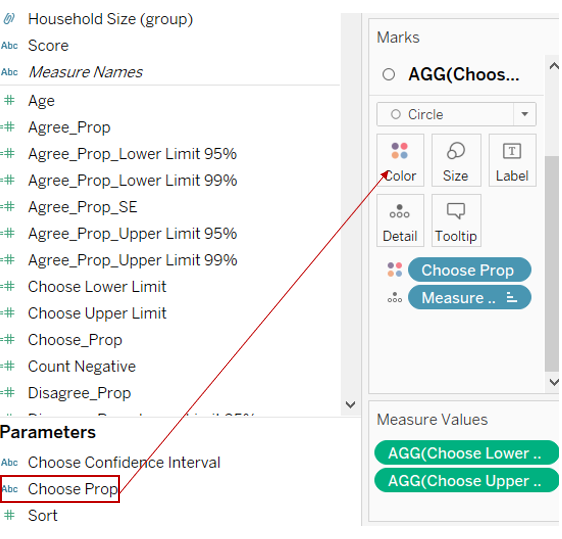 Step 14: Drag “Choose Prop” into the Colour Marks card under “Measure Values”.