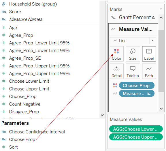 Step 12: To synchronize the colour of the proportion chart with the Gantt chart, drag “Choose Prop” into the Colour Marks card under “AGG(Choose Prop)” as shown below.