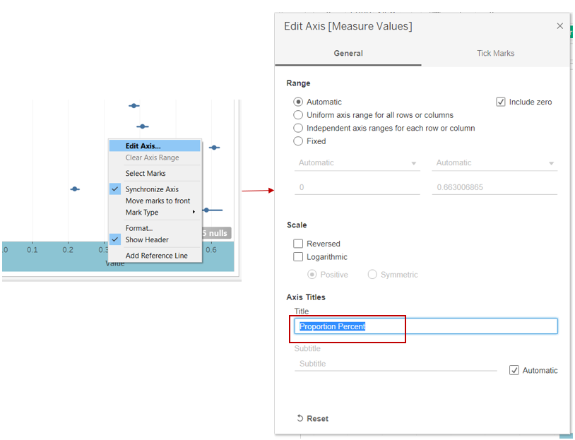 Step 16: Rename the axis by clicking on the axis and select “Edit Axis”. Change the Axis Title to “Proportion Percent”.