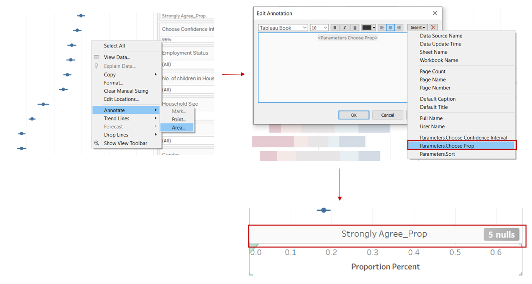 Step 17: Add annotation by clicking on the chart, select “Annotate” and “Area”. In the pop-up window, click “Insert” and select “Parameters.Choose Prop”. Shift the annotation area to be just slightly above the x-axis as shown below.