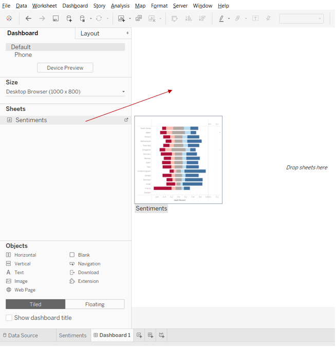 Step 1: Open a new Dashboard tab, drag the worksheet into the pane.