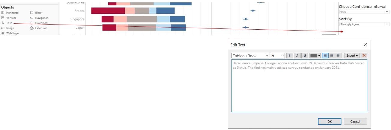Step 4: Drag “Text” to above the chart and input the data source as shown.