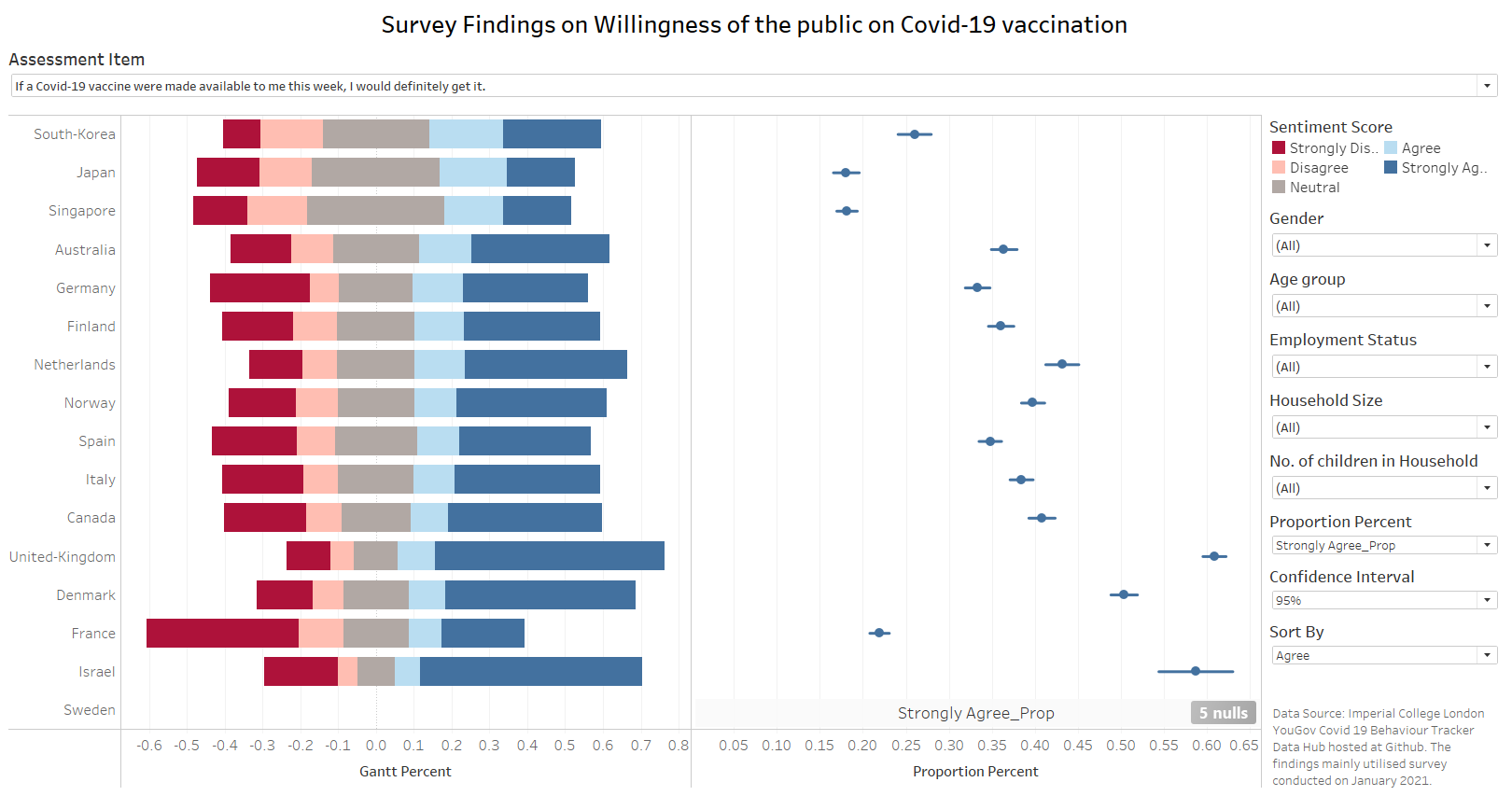 | 1 | The left bar chart is showing the responses received from the question “If a Covid-19 vaccine were made available to me this week, I would definitely get it.” and not “Which country is more pro-vaccine?” The title confuses readers as readers may be expecting a country rather than “1 - Strongly agree” to “5 - Strongly disagree”. | Use a more appropriate title for the chart e.g. “Willingness of people to get vaccinated if a vaccine is made available to him/her this week.” |